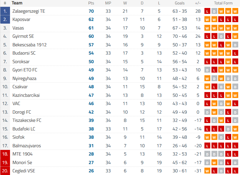 So Gyirmót finally lost 3-1, but Kaposvar managed to win, keeping them just ahead of Vasas with four to play. Still, it’s been an amazing turnaround for the
