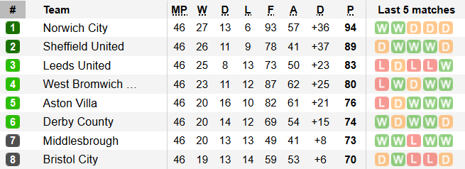 For Middlesbrough it’s the opposite. Looking comfortable for the playoffs (and even a chance of automatic promotion) for the most part, they threw everything away with a 6-game losing streak in March and April. A mini-rally saw them back in contention but in reality few would argue that they deserve to be in the top 6.