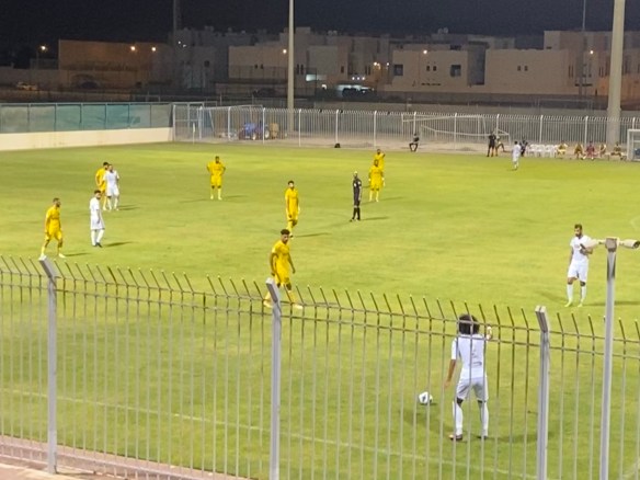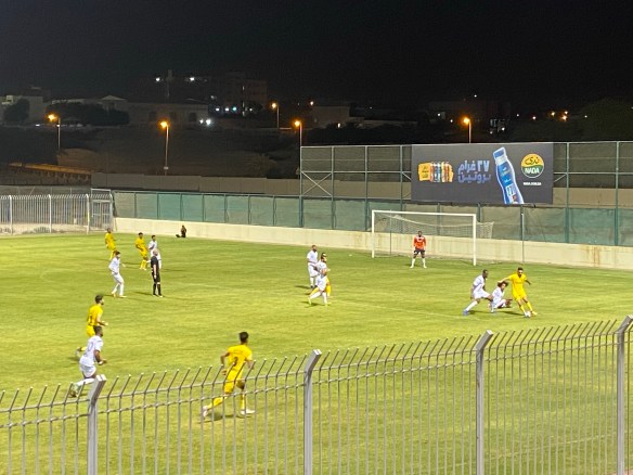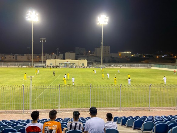 I actually find my way to Riffa Sports Club first time (a first for me in Bahrain, where one missed exit or wrong turn can see you careering miles out of your way on a motorway). The Riffa complex is impressive, with a huge indoor sports centre and numerous artificial pitches. The ground itself is less so; just a single stand of around 1000 seats facing the clubhouse. Finally, blessedly, we have a nice little concession hut, selling drinks and snacks – something I really could’ve done with back in Hamad Town. It is once again punishingly hot, and I’m soon soaked to the skin. Autumn can’t come fast enough.