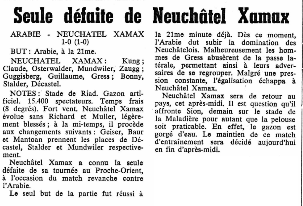 The trip was billed as an “Orient Tour”, and began in Bahrain with a hard-fought 1-0 victory against the hosts. French newspapers described Xamax as dominating physically, despite the 23° heat, noting also that the visitors “took the match seriously”, making no spurious substitutions during the 90 minutes. Jean-Michel Guillaume scored the only goal.